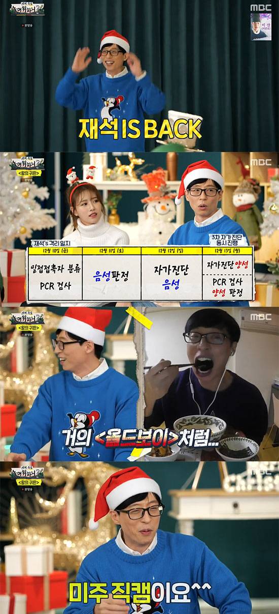 이날 유재석은 자가격리를 마치고 건강히 멤버들 곁으로 돌아왔다. 그는 "갑작스러운 소식으로 본의 아니게 심려를 끼쳐드려서 죄송하다"라고 인사했다. 유재석은 "처음에 (확진 판정) 전화를 듣고 힘이 쭉 빠지더라"라며 "다행히 증상이 없었다, 그래서 빨리 회복할 수 있지만 그래서 더 조심해야겠다고 생각했다"라고 말했다.그러면서 "증상이 별로 없다"면서 "어떤 분은 목소리가 괜찮으니까 내일 만나자 하더라"고 덧붙여 웃음을 안겼다.