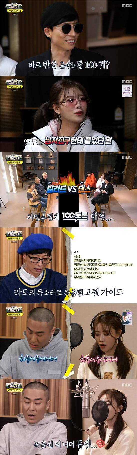 라도는 "혹시 몰라서 준비했다"라며 댄스곡을 공개했다. 하하는 "답답함이 해소된다"라고 칭찬했고, 미주도 "겨울냄새가 전주부터 난다. 길거리에서 울려 퍼질 것 같다"고 이야기했다. 하지만 비밀투표에도 3:3 동점이 나오자, 발라드와 댄스를 두고 100분 토론이 펼쳐졌다. 오랜 고민 끝에 첫번째 곡으로 정했고, 녹음에 들어갔다. 라도의 칭찬속에 자신감이 생긴 유재석은 안정적인 노래실력을 자랑했다. 하하는 랩파트를 한 큐에 성공시켰고, 토요태의 메인보컬 미주는 라도의 맞춤 음역대로 매력을 더욱 살렸다. 특히 라도는 미주를 디렉팅하며 듀엣을 펼쳐 눈길을 끌었다. 이에 멤버들은 "둘이 뭐야? 영화 찍어?"라며 핑크빛 분위기에 소리를 질렀다.