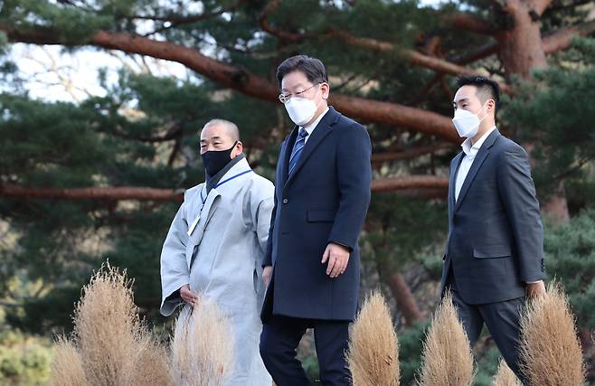 | ▲ 더불어민주당 이재명 대선후보가 임인년 새해 첫날인 1일 경남 양산시 통도사를 방문, 주차장에서 내려 경내로 이동하고 있다. |