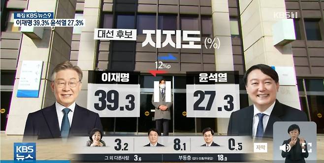 | ▲ 두 후보의 지지율 차이가 가장 컸던 건 한국리서치가 KBS 의뢰로 한 조사결과다. 이 후보는 39.3%의 지지율을 기록해 윤 후보(27.3%)를 오차범위(±3.1%포인트)를 벗어나 12%포인트 앞섰다. |