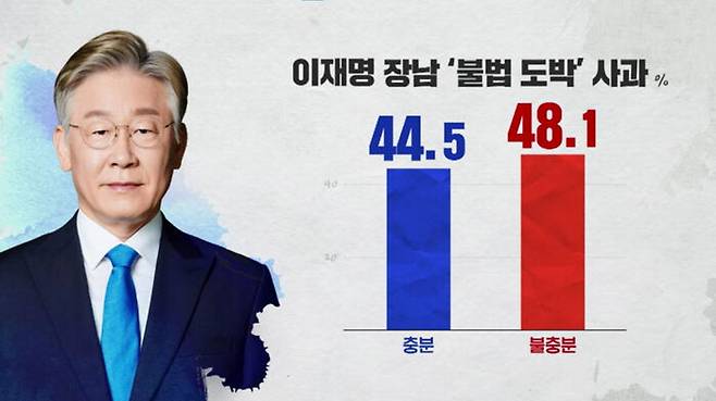 민주당 이재명 후보가 장남의 불법 도박을 인정하고 사과한 데 대해 어떻게 생각하는지 물었는데 사과가 충분했다 44.5%, 충분하지 않았다 48.1% 였습니다.