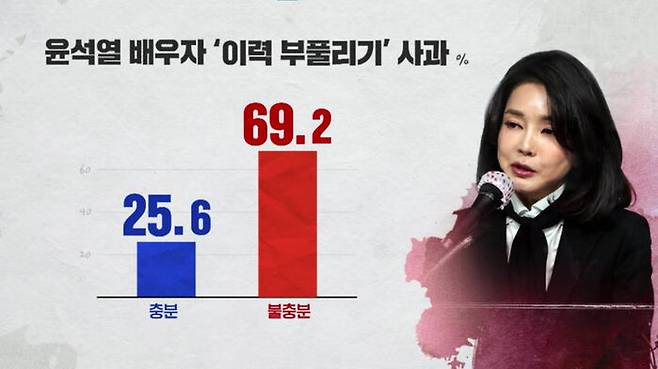 국민의힘 윤석열 후보의 배우자, 김건희 씨의 '이력 부풀리기' 사과에 대해서는 충분했다 25.6%, 충분하지 않았다 69.2%로 '부정적' 답변이 배 이상 많았습니다.