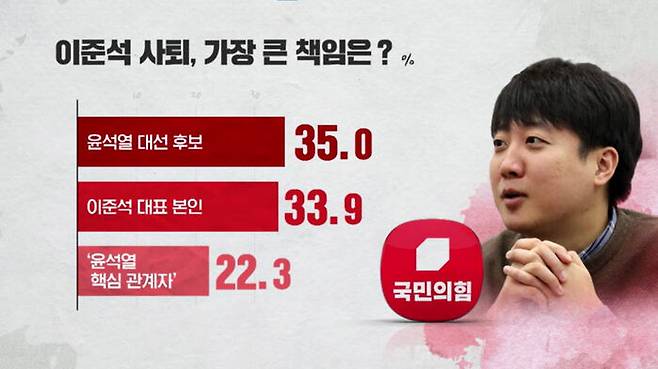 이준석 국민의힘 대표가 상임선대위원장직을 사퇴한 것과 관련해 누구의 책임이 가장 크냐는 질문에는 윤석열 후보 35% 이준석 대표 본인 33.9% 로 비슷했고 소위 '윤석열 핵심 관계자'가 22.3%로 뒤를 이었습니다.