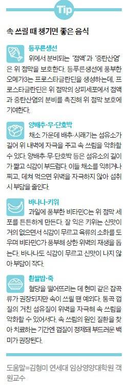 속 쓰림을 최소화하면서 이들 영양소를 섭취하려면 싱겁고 부드러운 식감의 죽·양배추·생선찜 등이 추천된다. 레몬·자몽·오렌지 같은 신맛의 과일류는 pH2 정도의 강한 산성을 띠는데, 식도 내벽을 자극하고 하부 식도 괄약근을 느슨하게 해 위산 역류를 부추기므로 속이 쓰릴 땐 피한다. 커피·콜라 같은 카페인 음료도 자제한다. 카페인이 위벽 세포의 쓴맛 수용체에 결합해 위산 분비를 촉진하는 데다 하부 식도 괄약근을 이완해 위산 역류를 유도한다.