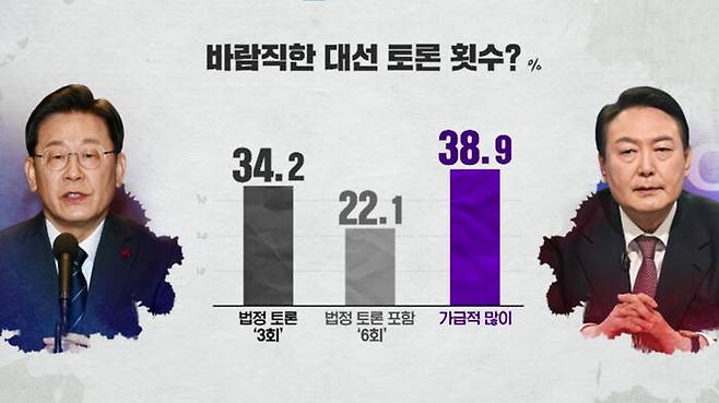 선거 기간 전이라도 가급적 많이 해야 한다는 응답이 38.9%로 가장 많았고, 법정 최소 횟수인 3번이 34.2%, 지난 대선처럼 6번이 22.1%로 뒤를 이었습니다.
