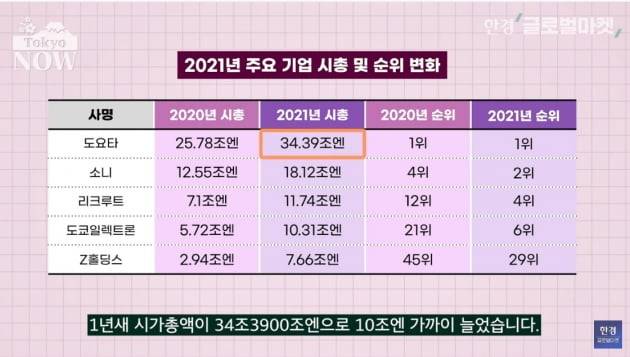 추락하는 기업이 있는 반면 코로나의 시대에 가치가 크게 뛰어오른 종목도 많았다. 성장주와 가치주의 매력을 모두 갖고 있다는 평가를 받는 도요타자동차는 1년새 시가총액이 34조3900조엔으로 10조엔 가까이 늘었다. 2020년 2위였던 소프트뱅크그룹과 시총이 4배 가량 벌어지면서 일본증시 절대 강자의 위치를 굳혔다.