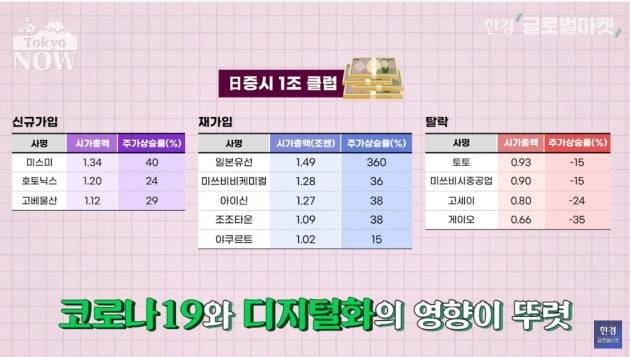 1조클럽에도 코로나19와 디지털화의 영향이 뚜렷하게 드러났다. 미쓰비시케미컬홀딩스, AGC(옛 아사히글라스) 등은 소재와 에너지주가 각광을 받으면서 시가총액이 1조원을 넘겼다. 반면 게이오전철, 오다큐전철 등은 코로나19 이후 출퇴근 이용자가 줄면서 시총이 30~40%씩 감소했다.