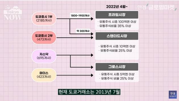 1부, 2부, 마더스, 자스닥 4개로 구성돼 있는 시장이 ‘프라임’ ‘스탠더드’ ‘그로스’로 재편되기 때문이다. 지금까지의 도쿄거래소는 2013년 7월 도쿄거래소와 오사카증권거래소를 통합한 것이다. 투자자들의 혼란을 막기 위해 두 거래소의 기존 시장을 유지했다.