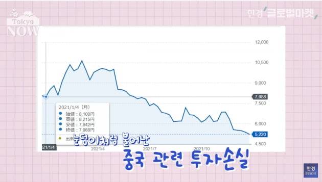 지난해 8100엔으로 시작한 주가가 3월8일 1만635엔까지 올랐다. 하지만 7~9월에만 3979억엔의 순손실을 내는 등 중국 관련 투자손실이 눈덩이처럼 불어나면서 주가가 12월27일 5220엔까지 내려앉았다.