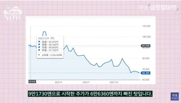 2020년말 일본 6위였던 패스트리테일링의 시가총액 순위도 16위로 주저앉았다. 9만1730엔으로 시작한 주가가 6만6360엔까지 빠진 탓이다. 시가총액도 9조1600억엔에서 7조400억엔으로 줄었다.