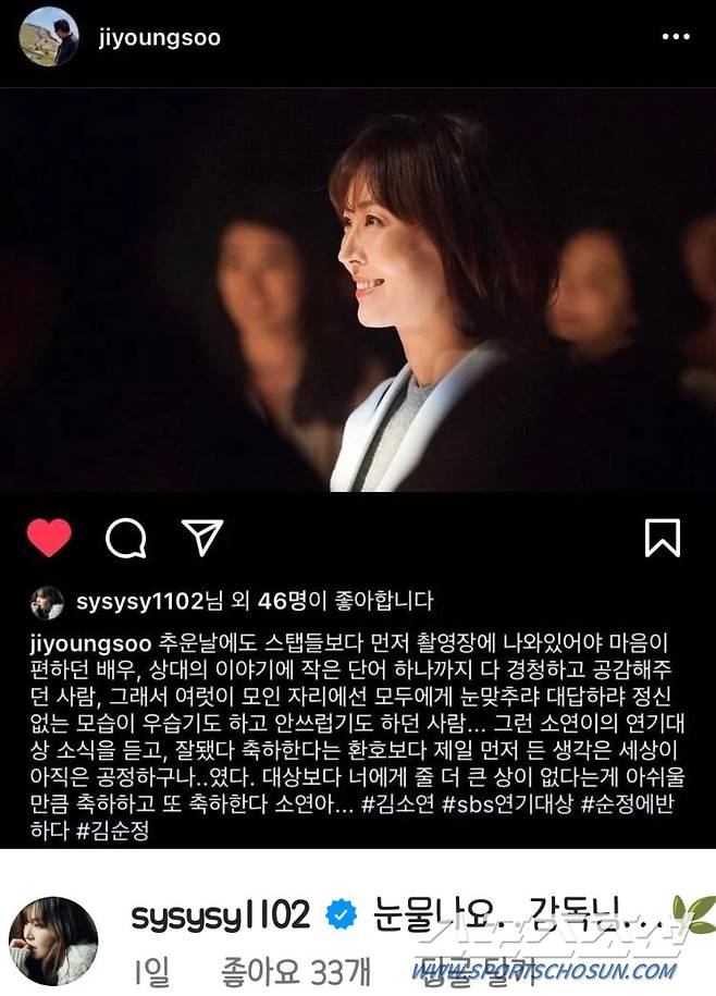 이에 김소연 또한 '눈물나요 감독님'이라고 화답의 댓글을 올렸다.