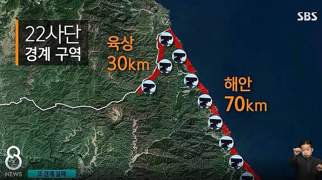 22사단의 책임 구역은 지형이 험하고 복잡하기로 유명합니다. 2014년 총기 난사의 주범 임 모 병장이 월북할 의도였지만 정작 남쪽으로 길을 잡은 데서 알 수 있듯, 말년 병장도 헷갈리는 심산유곡입니다. 육상 30km, 해안 70km에 달하는 22사단의 경계 범위는 김포의 해병대 2사단에 비할 바 아니지만 육군에서는 가장 광활합니다. 사단이 아니라 군단 전체를 쏟아부어도 한두 명의 월북, 귀순은 가끔씩 발생할 수밖에 없는 곳으로 통합니다. 월북, 귀순하는 사람들이 22사단을 탈출 루트로 택하는 데는 그만한 이유가 있습니다.