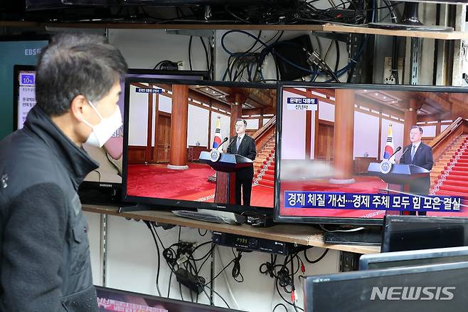 [서울=뉴시스] 백동현 기자 = 문재인 대통령이 신년사를 발표한 3일 오전 서울 중구 황학동 시장에서 한 시민이 TV를 시청하고 있다. 2022.01.03. livertrent@newsis.com