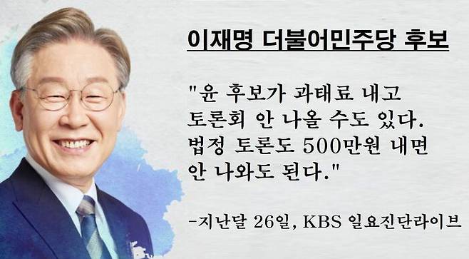 이재명 후보 : (윤 후보가) 과태료 내고 안 나올 수도 있다. 법정 토론도 500만 원 내면 안 나와도 된다.