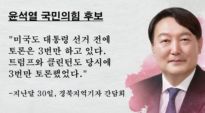 윤석열 후보 : 미국 대선에서도 토론 3번만 한다. 트럼프와 클린턴도 그랬다. …… 내가 이런 사람하고 토론을 해야 하나? 어이가 없다. 정말 같잖다.