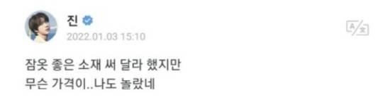 진 역시 위버스를 통해 "잠옷 좋은 소재 써 달라고 했지만 무슨 가격이... 나도 놀랐네"라고 적어 당황스러움을 표했다.