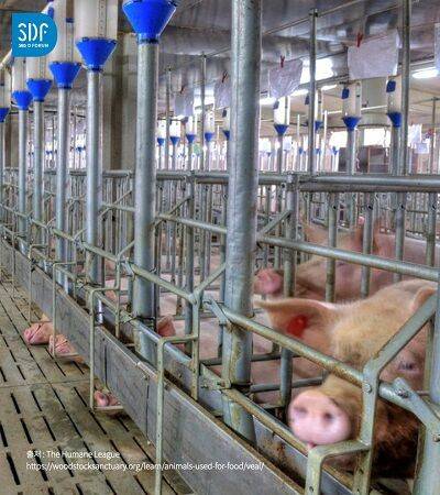 다음은 대형 축사의 돼지들입니다. 지능이 높은 동물인 돼지들이 종일 아무것도 못 하며 감옥 같은 곳에서 살아갑니다.
