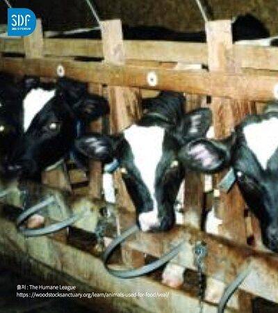 먼저 고기용 송아지들입니다. 평생을 이런 나무 외양간에 갇혀 걷지도, 뒤돌아서지도 못 하고 살아갑니다.