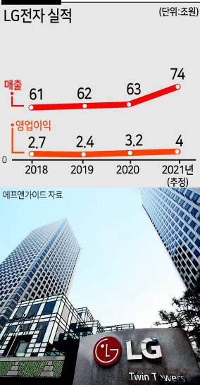 LG전자는 연간 기준 처음으로 매출액 74조원, 영업이익 4조원 돌파가 기대된다. 수익성이 높은 프리미엄 신가전 위주의 판매 전략이 먹혔다는 분석이다. 스타일러, 건조기 등 신가전 판매도 역대 최대치를 찍는다. 기대를 모았던 전장사업부(VS)가 반도체 부품난에 따른 타격으로 크게 고전(9000억원 영업적자 예상)했지만, 생활가전(연간 매출 27조원)과 TV사업(17조원)이 쌍끌이로 실적 개선을 이끌었다.