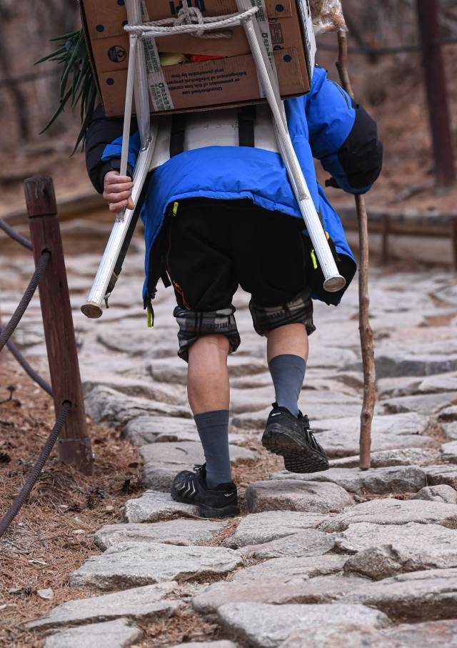 지난달 21일 강원도 설악산 흔들바위로 향하는 등산로에서 임기종(66)씨를 본 등산객이 눈이 휘둥그레져 말했다. 160㎝가 되지 않는 호리호리한 체격이지만 그의 등에는 키만큼 높은 채소와 과일 상자가 탑처럼 쌓여있었다. 임씨는 설악산에 남은 마지막 지게꾼이다. 막노동을 하면서 한 달에 4~5번 60㎏이 넘는 짐들을 흔들바위 옆으로 옮긴다. 일을 시작할 때는 60여명의 동료들이 함께했다. 하지만 휴게소나 산장들이 없어지고, 일감도 줄면서 모두 떠나고 혼자 남겨졌다.