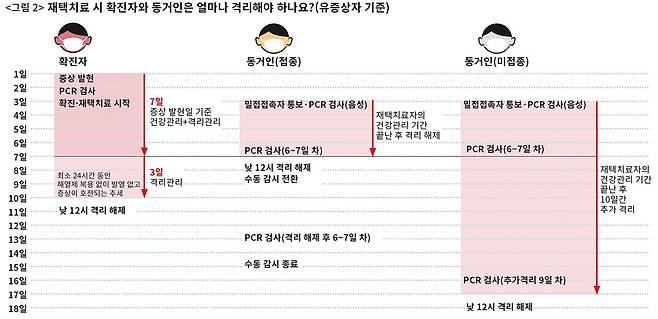 ‘격리 기간’은 정부가 새로운 지침을 만들 때마다 변동이 잦은 편이다. 여기서는 2022년 1월1일에 처음으로 코로나19 증상이 생기고 1월3일 재택치료를 시작한 경우를 가정해서 확진자, 백신접종 완료 동거인, 백신 미접종 동거인 등의 격리 기간을 정리했다(〈그림 2〉). 가장 최근 발표된 ‘코로나바이러스감염증-19 재택치료 안내서 제5판’을 참조했다.