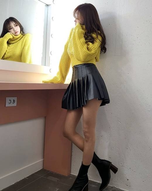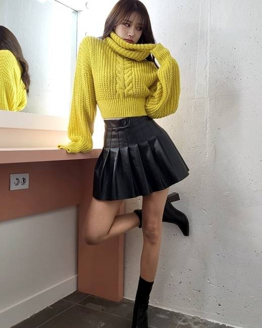 공개된 사진 속에는 노란색 니트에 스커트를 입은 채 포즈를 취하고 있는 이미주의 모습이 담겨있다. 큰 키와 롱다리가 시선을 끈다.