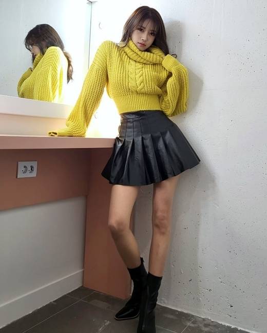공개된 사진 속에는 노란색 니트에 스커트를 입은 채 포즈를 취하고 있는 이미주의 모습이 담겨있다. 큰 키와 롱다리가 시선을 끈다.