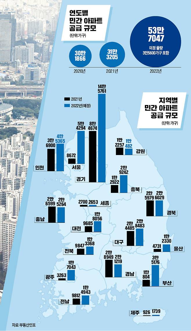 한국경제신문과 부동산정보업체 부동산인포가 공동으로 시공능력평가 300위 내 건설회사를 대상으로 ‘2022년도 분양 계획’을 조사한 결과 전국에 53만7047가구가 공급될 것으로 집계됐다. 지난해 공급량(31만3205가구)보다 22만3842가구(71.4%) 증가한 수치다. 최근 5년간 공급된 민간 아파트는 △2018년 25만7722가구 △2019년 29만924가구 △2020년 30만1866가구 △지난해 31만3205가구 등 25만~30만 가구 수준이었다.