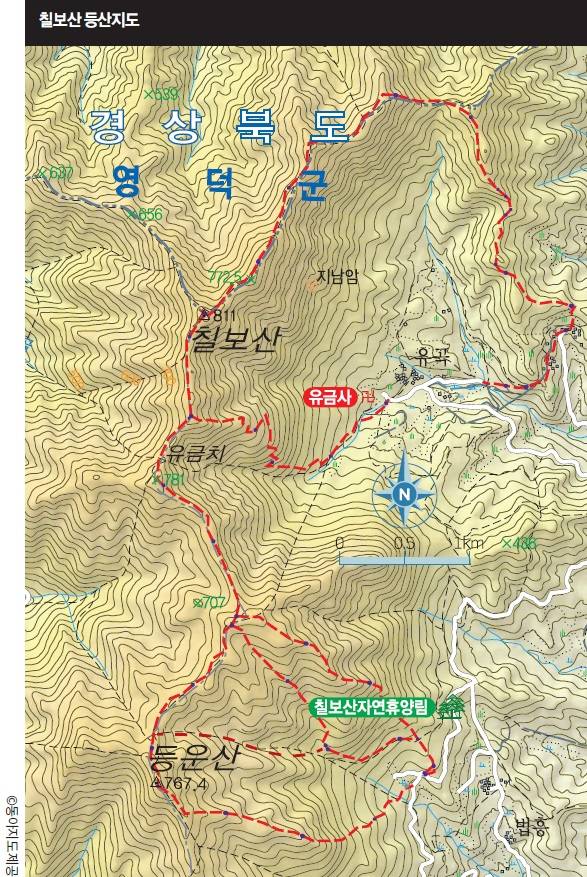 편안한 능선을 달음박질하듯 걷는다. 칠보산 정상이 가까운 안부는 유금사有金寺로 내려설 수 있는 갈림길인 유금치. 유금사는 신라 선덕여왕 시기 자장율사가 창건한 사찰로 보물인 3층석탑이 있는 절이다. 유금이란 지명은 과거 이곳에 금이 손으로 주울 정도로 많다해서 붙여진 것이라고 한다. 유금치에서 400m 정도 진행하면 헬기장, 여기서 마지막으로 오르면 곧 칠보산 정상이다.