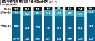 공정위의 전부승소율이 80%를 넘은 것은 지난 2014년 80.3%를 기록한 이후 7년 만에 처음이다. 2016년 77.3%를 기록한 것 외에는 모두 70%대 초반으로 고전했다. 2020년에는 특히 이례적으로 낮아 70%대를 겨우 넘겼다.