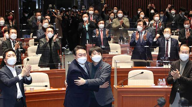얼싸안은 이 대표와 윤 후보의 모습을 보고 의원들의 박수와 웃음이 터져 나오며 순식간에 '대화합'의 장이 펼쳐졌습니다.