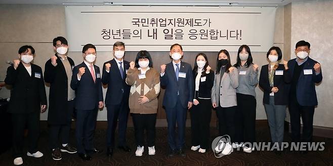 (서울=연합뉴스) 박화진 고용노동부 차관(왼쪽 여섯 번째)이 7일 오전 서울 중구 롯데호텔에서 열린 국민취업지원제도 일경험프로그램 훈련연계형 간담회에서 참석자들과 기념 촬영을 하고 있다. 2022.1.7