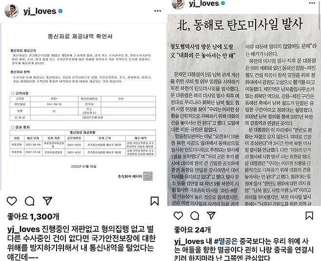 정 부회장은 7일 자신의 인스타그램을 통해 검찰에 통신자료 조회를 당한 사실을 알리면서 자신에 대한 통신자료 제공내역 확인서를 공개했습니다.