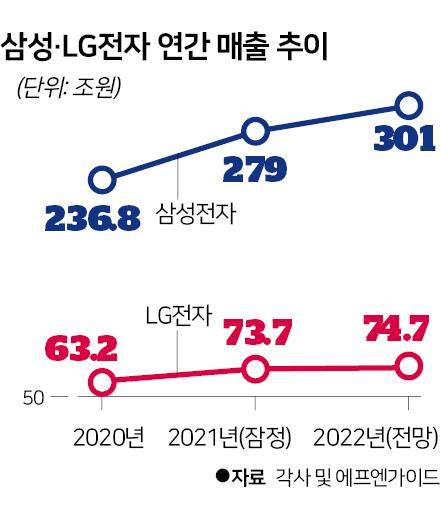 삼성전자와 LG전자가 지난해 나란히 창사 이래 최대 실적을 거뒀다. 코로나19 변이 바이러스 유행 등 어느 해보다 대외 불확실성이 컸지만, 삼성전자와 LG전자는 각각 주력 제품인 반도체와 가전을 앞세워 그야말로 눈부신 성과를 거뒀다.