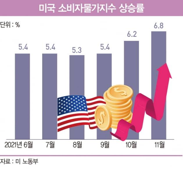 미국의 소비자물가지수는 2021년 11월 기준 6.8%(전년 동기 대비) 급등했다. 1982년 6월 이후 최대 상승폭으로 기록됐다. 변동성이 큰 에너지·식품을 제외한 근원 소비자물가 역시 4.9% 뛰었다.