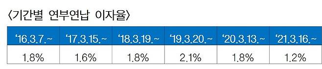 연부연납을 신청하면 세금을 천천히 내는 만큼 연부연납 가산금, 즉 일정한 이자를 내야 한다. 연부연납 이자율은 계속 변동됐는데 2021년 3월 16일 이후부터는 1.2%의 이자율이 적용되고 있다.