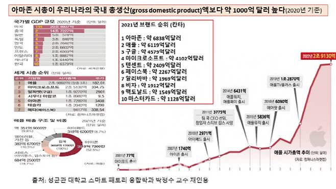 아래 그림은 MaaS(Mobility as a Services) 분야의 지적재산권을 가장 많이 보유하고 있는 세계 브랜드 가치 1위 미국 기업 아마존 시총이 우리나라의 국내 총생산(gross domestic product) 액보다 약 1000억 달러 높다는 것은 놀라운 일이다. 또한 애플이 2022년 새해 주식시장에서 세계 최초로 시가총액 3조 달러(약 3579조 원)를 돌파했다. 3조 달러는 일개 기업 가치로는 경이로운 규모다. 국가별 경제로 따지면 세계에서 국내총생산(GDP)이 영국(2조 7642억 달러)을 제쳤고, 독일 GDP(3조 846억 달러)도 넘보는 성과다.