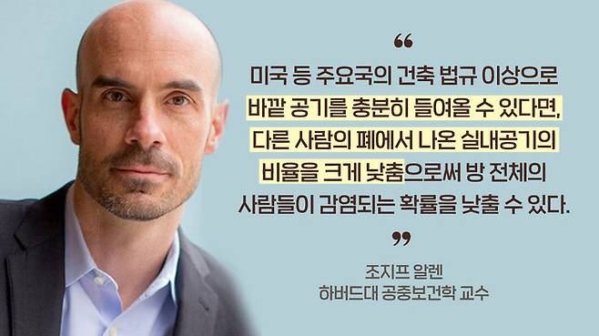 하버드대학의 공중보건학 교수로, 실내 공기 질 문제를 지속적으로 제기하고 있는 조지프 알렌은 지난해 10월 시사교양지 『애틀랜틱』 기고문에서 이런 질문을 제기했다. '다른 사람들이 입을 헹군 물을 함께 마신다면 어떻겠는가. 기겁할 일 아닌가? 그런데, 호흡은?'