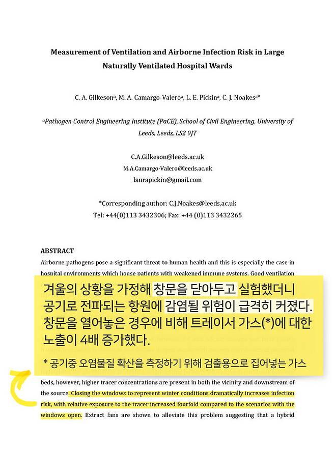 영국 리즈 대학은 지난 2013년 병원내 호흡기질병 확산과 환기의 효과에 대한 연구 논문을 발표했다. 호흡기 질환 환자의 지속적인 기침으로 병원내 실내공기에 항원이 확산되는 상황을 시뮬레이션한 연구였는데, 겨울철을 가정해 창문을 닫아놓은 경우 항원에 대한 노출 위험이 창문을 열어놓은 경우보다 4배 커지는 것으로 나타났다.