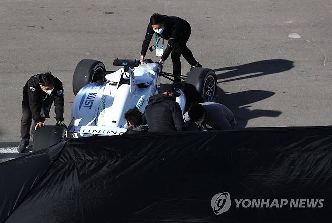 (라스베이거스=연합뉴스) 이지은 기자 = 세계 최대 전자·IT 전시회인 'CES 2022' 마지막날인 7일(현지시간) 미국 네바다주 라스베이거스 모터스피드웨이에서 열린 'CES 자율주행 챌린지'에서 한국 과학기술원(KAIST) 팀이 미국 어번대학교를 상대로 경기를 마친 뒤 레이싱카를 피트로 이동하고 있다. 세계 대학팀들이 참가한 가운데 열린 이 대회에서 카이스트팀은 4등을 기록했다. 이 대회는 인간 레이서 없이 최대 시속 300㎞로 달릴 수 있는 레이싱카로 실력을 겨룬다. 2022.1.8