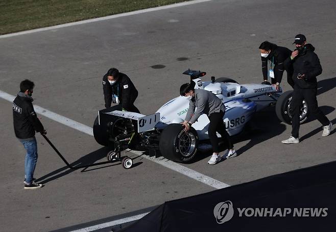 (라스베이거스=연합뉴스) 이지은 기자 = 세계 최대 전자·IT 전시회인 'CES 2022' 마지막날인 7일(현지시간) 미국 네바다주 라스베이거스 모터스피드웨이에서 열린 'CES 자율주행 챌린지'에서 한국 과학기술원(KAIST) 팀이 미국 어번대학교를 상대로 경기를 마친 뒤 레이싱카를 피트로 이동하고 있다. 세계 대학팀들이 참가한 가운데 열린 이 대회에서 카이스트팀은 4등을 기록했다. 이 대회는 인간 레이서 없이 최대 시속 300㎞로 달릴 수 있는 레이싱카로 실력을 겨룬다. 2022.1.8