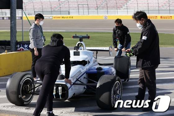 (라스베이거스(미국)=뉴스1) 조태형 기자 = 세계 최대 전자·가전·정보기술(IT) 전시회 CES 2022 마지막 날인 7일(현지시간) 미국 네바다주 라스베이거스 모터 스피드웨이에서 열린 인디 자율주행 챌린지에 참가한 한국과학기술원(KAIST) 심현철 교수를 비롯한 팀원들이 자율주행 레이싱카를 준비하고 있다. 최대 300km/h까지 주행 가능한 자율주행 레이싱카로 경쟁하는 이번 대회에 아시아 유일팀인 KAIST는 4위를 기록했다. 2022.1.8/뉴스1