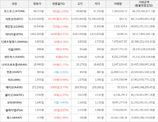 또한, 에이브(3.77%, 272,200원), 체인링크(2.34%, 32,840원), 왁스(1.96%, 519원), 니어프로토콜(1.77%, 18,980원), 폴리곤(1.57%, 2,590원), 코스모스(1.05%, 48,310원), 플레이댑(0.67%, 1,505원), 샌드박스(0.5%, 6,040원), 리플(0.42%, 948원), 디센트럴랜드(0.26%, 3,800원), 이더리움(0.15%, 3,961,000원)이 상승세를 나타냈다.