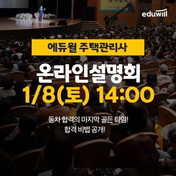 종합교육기업 에듀윌(대표 이중현)은 주택관리사 ‘온라인 설명회’를 오늘(8일) 14시, 유튜브 생방송을 통해 공개한다고 8일 밝혔다.