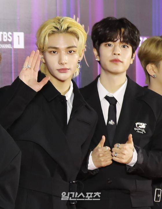 그룹 스트레이키즈의 현진,승민이 8일 오후 서울 구로구 고척스카이돔에서 언택트로 열린 ‘36회 골든디스크 어워즈' 레드카펫 행사에 참석해 포토타임을 갖고 있다.