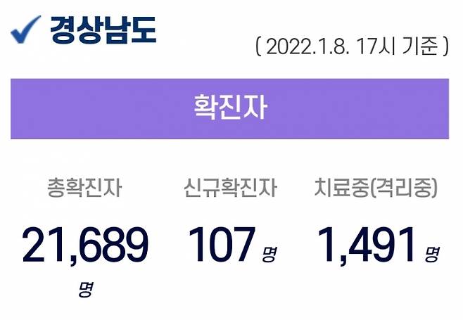 8일 오후 5시 기준, 경남도내 입원 중인 확진자는 1491명이고, 퇴원 2만 97명, 사망 101명, 누적 확진자는 총 2만 1689명이다.