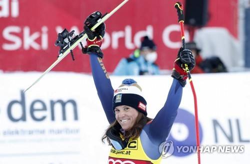 epa09673538 Winner Sara Hector of Sweden celebrates on the podium for the Alpine Ski World Cup's Giant Slalom Women in Kranjska Gora, Slovenia 08 January 2022. EPA/ANTONIO BAT