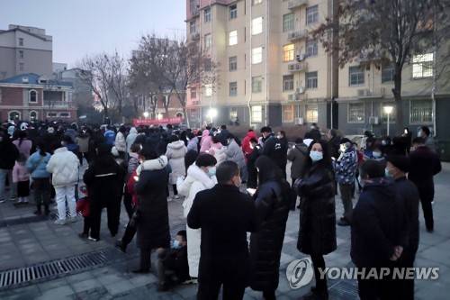 Residents line up for mandatory COVID-19 tests amid a lockdown in Huaxian county in central China's Henan Province, Saturday, Jan. 8, 2022. Authorities are implementing increasingly stringent measures following a coronavirus outbreak in Henan province, just west of Shaanxi province, where the capital Xi'an, a city of 13 million, has been under strict lockdown for more than two weeks. (Chinatopix via AP) CHINA OUT