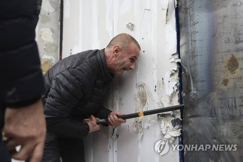 A protester uses a metal stick as he tries to invade at the headquarters of Democrats' Party in Tirana, Albania, Saturday, Jan. 8, 2022. Albanian opposition supporters have clashed with each other and tried to storm their party headquarters following an internal fight for the party leadership. Former leader Sali Berisha of the main opposition Democratic Party has created a grouping trying to remove the party leader Lulzim Basha from the post accusing him of being a "hostage" of Prime Minister Edi Rama. (AP Photo/Franc Zhurda)