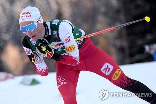 epa09673694 Johannes Lamparter of Austria in action during the cross country skiing portion of the Men Individual Gundersen NH106/10km competition at the FIS Nordic Combined World Cup in Val di Fiemme, Italy, 08 January 2022. EPA/ANDREA SOLERO